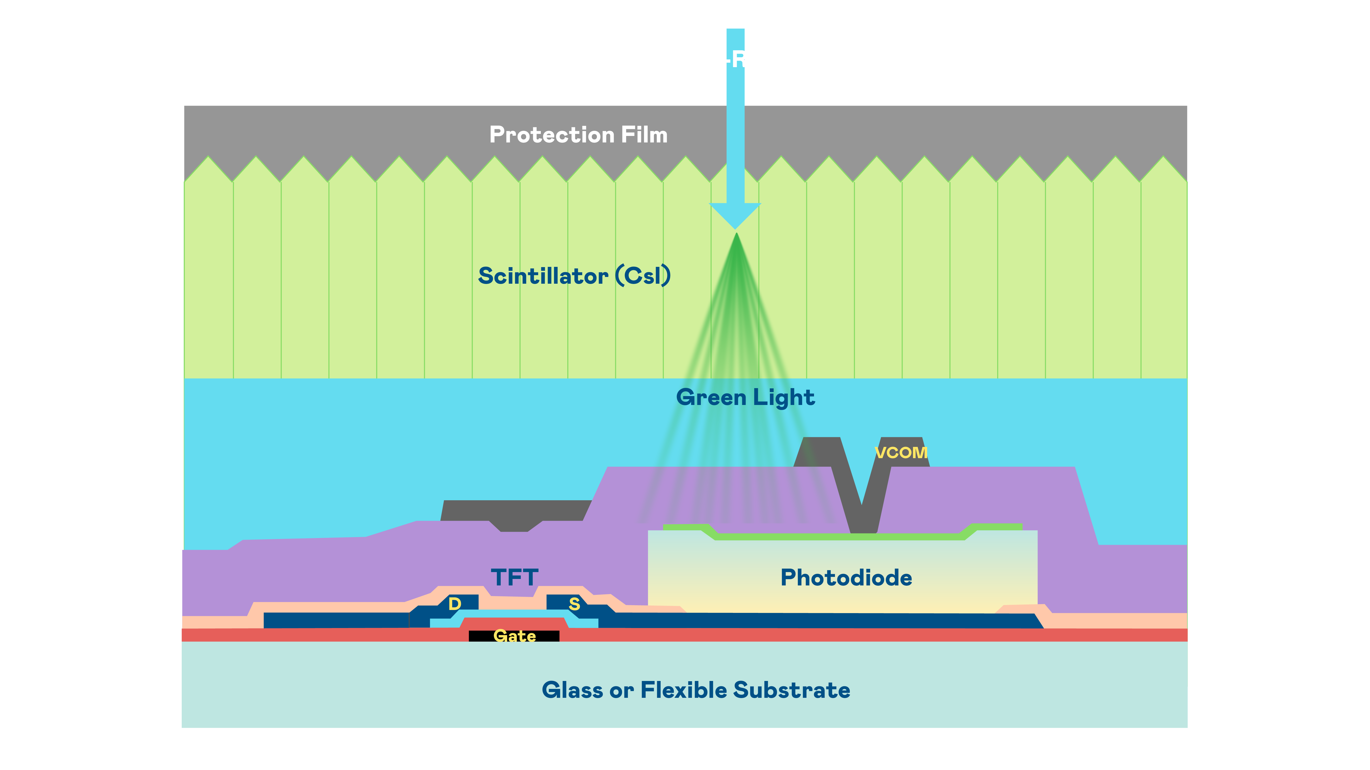 BG真人的X光影像感测阵列使用薄膜电晶体 (TFT) 作为每个像素的读取开关,搭配光电二极体(Photodiode)的光电转换元件,用以感测X光影像讯号。